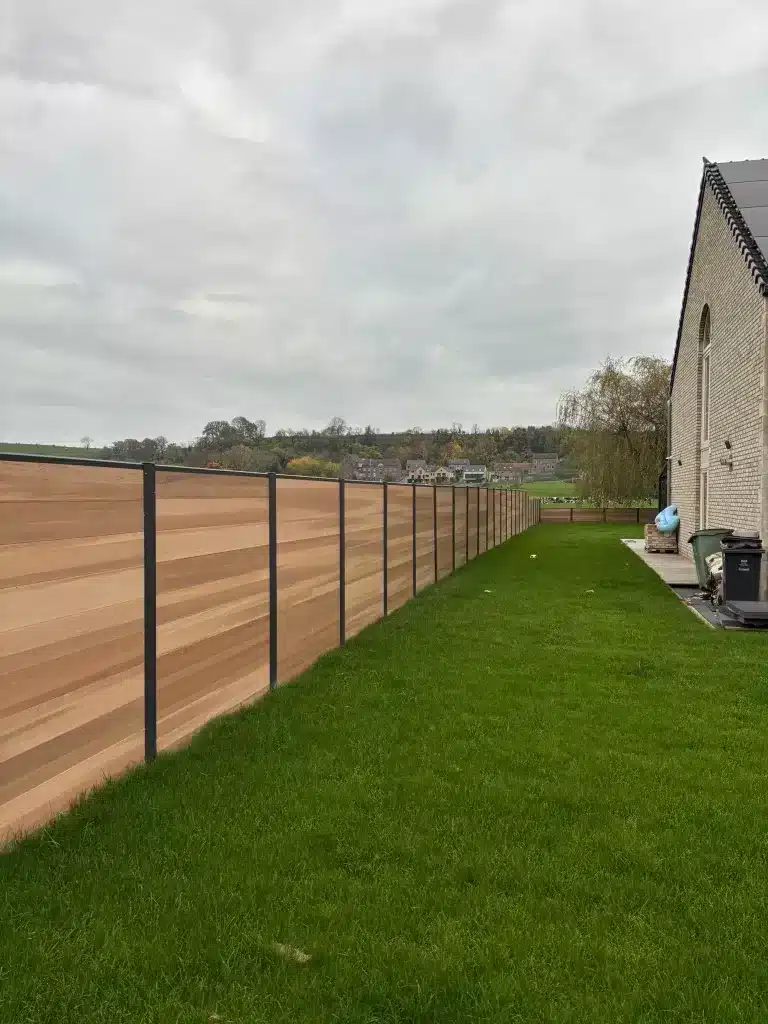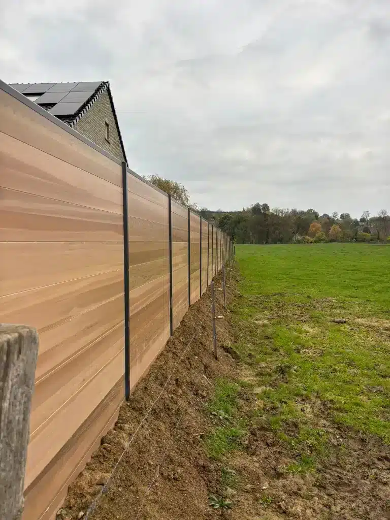 Palissade en composite dont la mise en œuvre est aisée et rapide grâce à un assemblage de planches dans les rainures du poteau ou dans des profilés.