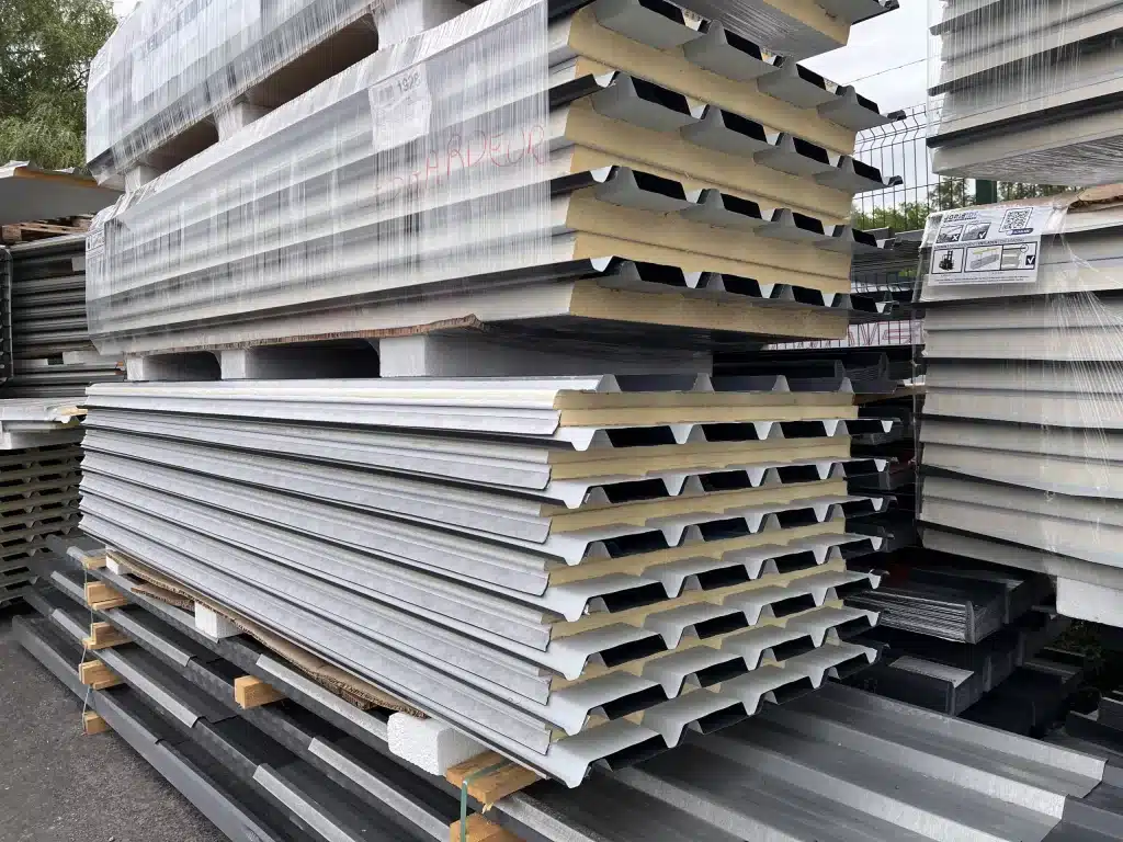 Les panneaux en tôle d’acier galvalisée ont été laqués en gris foncé (RAL 7016) et isolés à l’aide de polyuréthane (couche de 30 mm). La finition intérieure est en aluminium stuqué et laqué en blanc cassé. Un démoussage de 100 mm fini le panneau et permet l’égouttage dans la gouttière ou de redoubler le panneau dans la longueur.